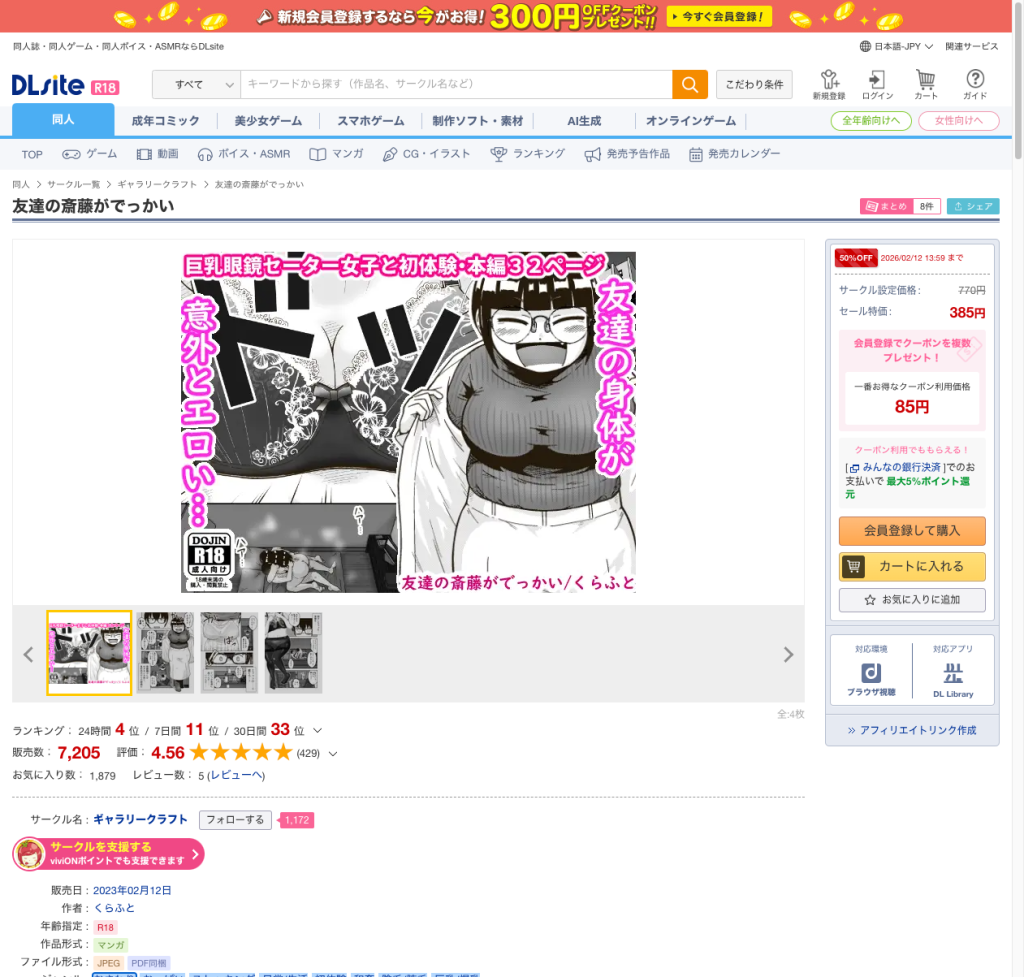 無料で読むことはできませんが、DLsiteに無料登録をすることで300円割引のクーポンを獲得できます。